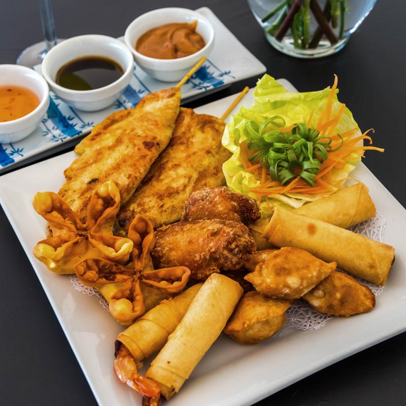 We had a great lunch. We ordered steamed pork dumplings, shrimp wrap, chicken satay, and crispy peanut chicken. Everything was delicious. Our server was friendly. She even sent us on our way with two complimentary bottles of water.